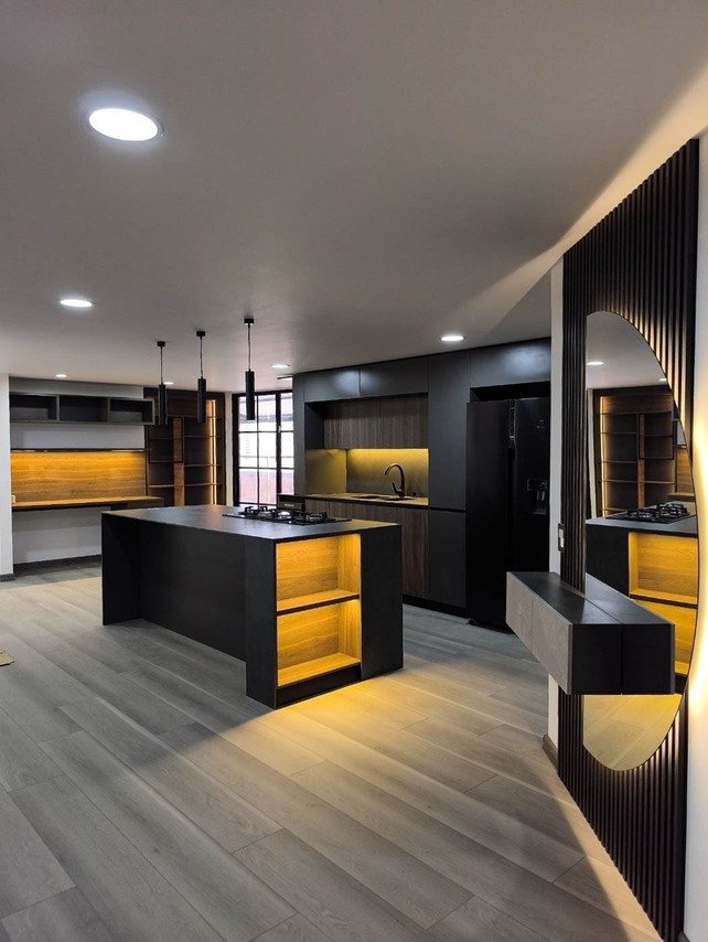 Las luces cálidas envuelven el espacio, creando un ambiente acogedor, elegante y perfectamente equilibrado.